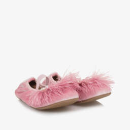 Cute grey ballerina shoes for little girls from British brand Age of Innocence. Made in soft velvet with durable leather lining and insoles, these comfortable slip-on shoes have glamorous feather and faux pearl decorations on the front.