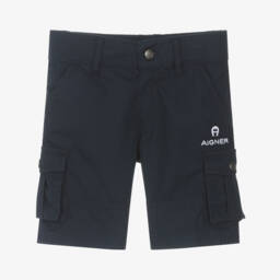 Beige Bermuda cargo shorts for baby boys by AIGNER, made in lightweight cotton. Fastening with a branded button, they have an adjustable waist for comfort, slanted front pockets, and popper cargo pockets on each leg. An embroidered navy blue logo, featuring the signature 'A' horseshoe motif, adds a distinctive finish.