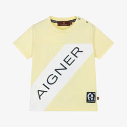 Navy blue T-shirt for baby boys by AIGNER, made in soft and stretchy cotton jersey. It has a bold white stripe across the front with a navy blue logo for instant brand recognition. There is a logo patch by the hem featuring the signature 'A' horseshoe logo and popper fastenings on one shoulder to help with dressing.