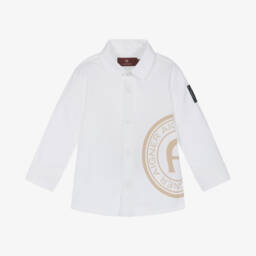 A white cotton poplin shirt for baby boys from AIGNER. Soft and lightweight, it fastens with branded buttons on the front and cuffs. For instant designer appeal, this smart shirt features a vibrant blue signature 'A' horseshoe logo print, with a branded patch on one sleeve.
