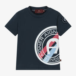 White cotton T-shirt for baby boys by AIGNER, with a circular 'A' horseshoe logo design on the front in navy blue, with red and blue stripes. Made in soft and comfortable jersey, it has poppers on one shoulder for quick dressing.