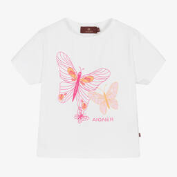 Comfortable pale orange cotton T-shirt for girls by AIGNER, made in soft, stretchy jersey. It has a pretty butterfly and logo print on the front in shades of pink and orange.