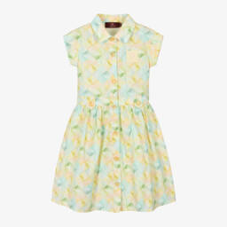 Girls pink and orange cotton shirt dress by AIGNER, with a beautiful geometric pattern. Cool and lightweight, it has capped sleeves and lovely flower-shaped button fastenings matching the decorative buttons on the waistband. The brand's signature 'A' horseshoe logo is on the chest.