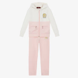 Fabulous summery trousers for girls by AIGNER, with an ornate pattern in pink and pale orange. Soft, comfortable and lightweight, they are made in cotton poplin with a half-lining. They have a pink, elasticated waistband with repeat, jacquard logos and a frilled trim. Easy to wear, they simply pull up.