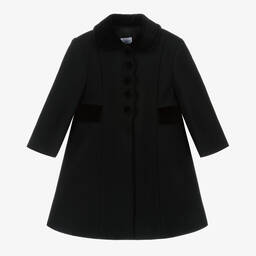 Classic pale blue coat for girls from Spanish brand Ancar, made in luxurious wool. For a traditional heritage look, it has a stitched velvet collar and pocket flaps, with matching covered buttons and a scalloped trim. It is designed with smart inverted pleats on the back for both style and ease of movement and has a beautiful tonal satin lining for comfort. Smaller sizes come with a matching bonnet, which neatly attaches to the coat.
