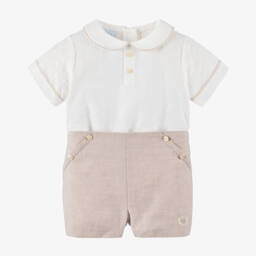 Traditional ivory and green shorts set for little boys by Artesanía Granlei, made in soft cotton. The lightweight shirt has a stripe in the weave, with knitted green trims and decorative buttons on the front. Lined for comfort, the shorts have a gently elasticated waistband and semi-elasticated cuffs for a comfortable fit. For a smart, tucked-in look, both pieces fasten together with buttons.
