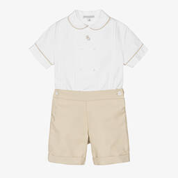White and navy blue traditional cotton shorts set for boys by British brand Beatrice & George, exclusive to Childrensalon. Made in lightweight poplin, the shirt has the designer's monogram logo embroidered on the front in navy blue, with matching piped trims on the collar and either side of the double-breasted button fastenings. The twill, navy blue shorts have pleats on the front, fasten on the sides with buttons and are fully lined for comfort. The shirt buttons onto the shorts, keeping boys neat and tidy.