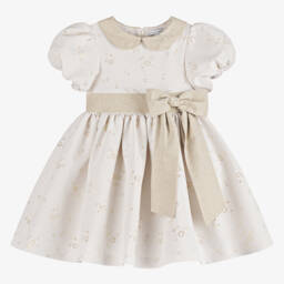 Shimmering gold special occasion dress for girls by British heritage brand Beatrice & George, with an ivory floral jacquard pattern. Exclusive to Childrensalon, the ivory, picot-trimmed collar, waistband and fixed bow have coordinating, shiny gold flowers. The dress has pretty puffed sleeves, a full, gathered skirt and is lined in soft voile for comfort.