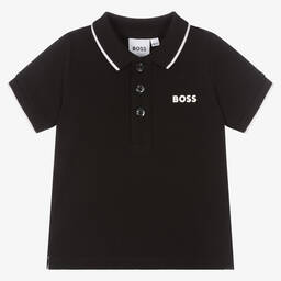 White short-sleeved polo shirt for little boys from BOSS, made in soft cotton piqué with navy blue trims. This classic, smart casual top has a ribbed collar, button fastenings and is finished with a navy blue rubberised logo on the chest.