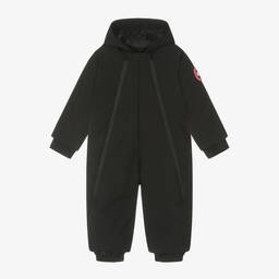 A blue hooded snowsuit for baby boys and girls from luxury outerwear brand Canada Goose, with the signature logo badge on one sleeve. Made from the brand's durable Arctic Tech technical fabric, it has water repellent qualities to keep warm and dry in extreme cold conditions. Luxuriously down padded, this cosy one-piece features a microfleece backing, heavy-duty, CORDURA reinforced sleeve cuffs which can fold over into mittens. The two front zip fastenings make dressing simpler, with a soft brushed trim on the wind guards for extra protection. The ankles have internal snow gaiters with branded elasticated cuffs for added grip around boots.