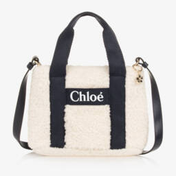 Lovely ivory bag for girls by luxury French designer Chloé, made in super soft sherpa fleece with tan brown woven carry handles. The large internal compartment has a magnetic popper fastener and is lined with two useful slip pockets. There is an attached leather strap, so this gorgeous bag can be carried on the shoulder and for a branded finish, it has the designer logo in white on the front pocket.