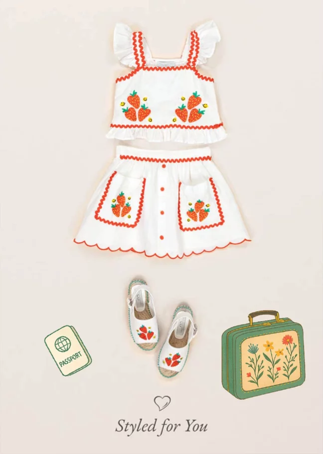 "Strawberries are my favourite food! And I love the big pockets on this skirt, so I can put all the shells I find on the beach in them." Ada, Age 5