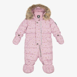 A padded snowsuit for baby boys and girls by Deux par Deux, designed in a very dark shade of grey. Made in silky soft fabric, this practical babysuit is weatherproof and breathable with a Bionic-Finish water repellent outer. It has a detachable faux fur trim on the hood and an adjustable inside waist for a comfortable fit and feel. The booties and mittens are easily removable with poppers and the adjustable rubber straps on the ankle help to hold boots in place. The interior is partly lined with soft polar fleece and the velcro placket partially conceals the zip fastening. A branded velcro snood, made in soft fleece, keeps their face and neck warm on outdoor adventures.