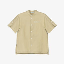 Dark blue Mini-me denim shirt for boys by luxury Italian brand Dolce & Gabbana, featuring an intricately embroidered DG logo in gold and green. Styled with classic denim over stitching, the branded poppers fastenings give this smart casual look an elevated designer finishing touch.