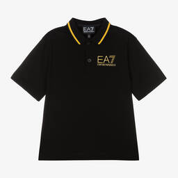 White short-sleeved polo shirt for boys by EA7 Emporio Armani, made in soft cotton jersey. In a classic polo style, there are branded button fastenings beneath the black tipped collar. It has a rubberised black EA7 logo print on the front for an instantly recognisable designer look.