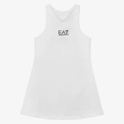 Navy blue sports dress and shorts set for girls by EA7 Emporio Armani, part of the brand's Tennis Pro collection. Silky smooth and stretchy, this sleeveless race-back style is made with Ventus7 technical fabric and has a stylish semi-sheer mesh panel for breathability. Adding an elevated designer touch, it has a white EA7 logo and iconic Eagle motif. It comes with matching shorts.