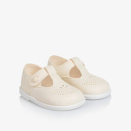 Black first walker shoes for little boys and girls by Early Days Baypods, in a classic T-bar design with a perforated pattern on the front for a traditional look. Ideal for taking those first little steps, these comfortable shoes are made in soft faux leather, with a gently cushioned textile insole. They fasten easily with a button and have a flexible, rubber outer sole for good grip and support.