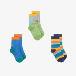 A lovely pack of three pairs of ankle socks for girls by Frugi. In shades of pink, blue and orange, these fun and colourful socks have animal-inspired designs. Soft and comfortable to wear, they are made from a stretchy organic cotton knit.