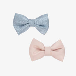 A pack of two small hair clips for girls by British brand Hucklebones, one in bright pink satin twill, the other in metallic gold. They are set on a silver-tone snap clip, covered and lined in grosgrain for a secure fit.