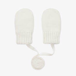 A pair of grey mittens for baby boys and girls by Jamiks. Soft and cosy for tiny hands, these mittens are lined with cotton fleece and luxuriously knitted in a wool and cashmere blend. The attached strap threads through the sleeves of their coat or jacket to ensure the mittens do not get lost.