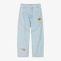 Casual, light blue denim shorts for girls by KENZO KIDS, made in soft cotton. For a fun designer touch, they have shiny, sticker-style fruit logo prints on the front and contrasting yellow stitching detail. The wide, elasticated waistband adds a comfortable finish and there are practical side seam pockets.