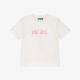 Ivory T-shirt for younger boys and girls by KENZO KIDS, made in soft and comfortable organic cotton jersey. Ideal for everyday casual wear, this crew neck tee has a large black Kenzo Paris logo printed on the front and branded popper fastenings on one shoulder for easy dressing.