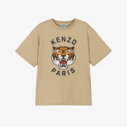 Light ivory T-shirt by KENZO KIDS featuring the brand's iconic tiger logo on the front, paired with bold branding, is ideal for boys and girls. Made from soft cotton jersey, this tee ensures comfort and ease of wear.