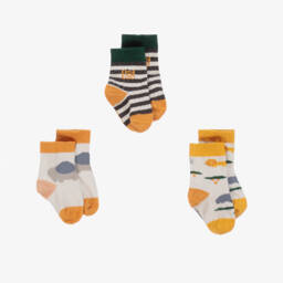A pack of three beige and pink ankle socks for little girls by Liewood, knitted in a soft, stretchy cotton blend. Two pairs have cute cherry designs, whilst one is striped in pink with red logos on the sides and mustard yellow toes.