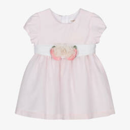 Smart ivory dress for baby girls by Mayoral, a lovely option for special events or parties. Sheer, with a slubbed weave, it has pretty puffed sleeves and a stylish mustard yellow, detachable belt with central floral appliqués. Fully lined for comfort, it comes with useful matching bloomers.