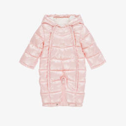 Ivory snowsuit for baby girls by Spanish brand Mayoral, with a lustrous sheen. Beautifully warm, it has a fixed hood and mid-weight padding, with detachable booties for extra cosiness. Fully lined in jersey for comfort, it has a double front zip fastening for easy dressing. The zip fastening between the legs and poppers securing the booties enables the snowsuit to become a snowbag.
