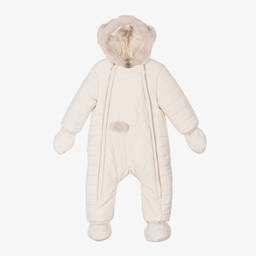 Adorable beige quilted snowsuit for baby boys and girls from Spanish brand, Mayoral. Silky smooth and warmly padded, it has a soft and comfortable cotton jersey lining and a useful double front zip fastening. For added protection, the neck opening secures with a popper, the cuffs are elasticated and smaller sizes come with detachable mittens and booties. To complete the cute look, there is an embroidered teddy design on the front, with faux fur trim and 3D ears on the hood.