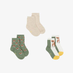 Three pairs of black, beige and turquoise blue ankle socks for little boys by Mayoral. Made in a soft cotton blend, these comfortable socks are patterned with cute dinosaur-themed designs.