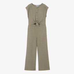 Smart-casual ivory jumpsuit for older girls by Mayoral, made in a soft and stretchy cotton blend. This stylish design is sleeveless and fastens down the bodice with faux tortoise shell buttons and a knotted tie. The waistband is elasticated for comfort and the legs are in an elegant wide leg style.