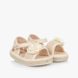 Girls pink sandals by Mayoral, with a charming satin floral decoration. In an espadrille design, they have woven uppers and a soft cotton-blend lining. Velcro fastening straps on the toe and ankle provide a comfortable fit and they have a ridged non-slip rubber outsole.