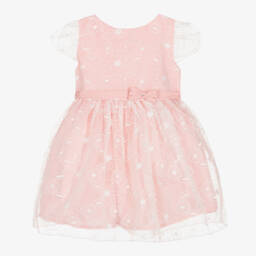 Lovely off-white organza dress for girls from Mayoral, beautifully embroidered in a floral pattern. Sheer on the little capped sleeves, it is fully lined in a soft cotton blend for comfort and fastens with a concealed zip on the back. To finish the look, it comes with a removable, bow belt trimmed with a sparkly diamanté and little pearls in the centre.