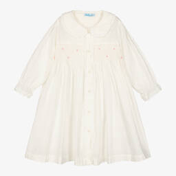 A beautiful pale pink dressing gown for girls by Mini Lunn, made in soft, lightweight plumeti cotton. It has a rounded collar, white lace trims and pretty pink roses embroidered on a delicately smocked panel across the front. Cool and comfortable to wear, it has softly elasticated cuffs and button fastenings on the front.
