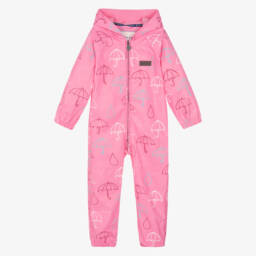 Bring on the rain with this fun, waterproof, navy blue puddlesuit for little boys and girls by Mitty James, with a colourful umbrella pattern. Exclusive to Childrensalon, it is soft and easy to wear, with a front zip fastening and an elasticated panel around the back for a good fit. The hood is lined in fleece for warmth and the cuffs are elasticated for extra cosiness. There is a rubberised grey logo badge on one side for a little designer detailing.