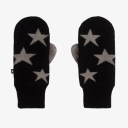 Beige mittens for boys and girls by Molo. Ideal for cooler temperatures, they are knitted in a warm wool blend and have a soft fleece lining for added cosiness. They have a brown jacquard star pattern with matching thumbs for a contrasting finish.