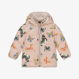Lovely pale blue puffer jacket for little boys and girls by Danish brand Molo. Made in silky smooth recycled fabric, this lightweight, water repellent jacket has an adorable snowy polar bear design. Lightly padded with recycled materials, it has a removable hood, which attaches with poppers, a front pocket and blue elasticated trims. It has a silky lining and a zip fastening on the front with a protective chin guard.