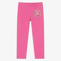Ivory leggings for girls by Moschino, made in soft and stretchy cotton jersey. These full-length leggings have a Moschino Teddy Bear logo on the front in pink, encircled by pretty, colourful flowers. They have a stretchy waistband for comfortable wear.