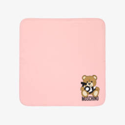 White blanket for baby boys and girls by Moschino, made in soft cotton jersey for delicate skin. Instantly recognisable, the brand's iconic Moschino Teddy Bear is printed on one side. It can be popped in the stroller on days out or used as a stylish accessory to match the nursery decor.