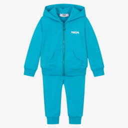 Candy pink tracksuit for little girls by MSGM, made in soft cotton jersey with matching blue brushstroke logo print. The zip-up top has a cosy hood and front pockets. The joggers have a back pocket and a comfortable elasticated waistband.