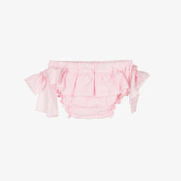 Pretty pale pink cotton sun hat for baby girls by classic brand Patachou. Soft and lightweight, this sweet baby accessory has a subtle geometric pattern, with a white lace trim and a sweet fixed bow on the front.