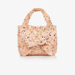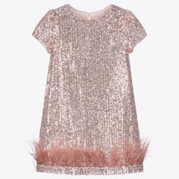 Beautifully sparkly for a special occasion, this pink dress for girls is by Patachou. Made in pink and gold sequin-covered tulle, it drapes into a lovely trapeze silhouette. To complement the glistening sequins are sheer tulle waterfall sleeves shimmer with gold glitter speckles. It is fully cotton lined for comfort, with button fastenings on the back.