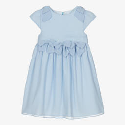Exclusive to Childrensalon, this gorgeous white dress for younger girls is by Patachou. Made in soft lightweight chiffon, it has cute capped sleeves, with fixed bows on the shoulders and waist. The full, gathered skirt has a tulle frill on the cotton lining for extra volume.