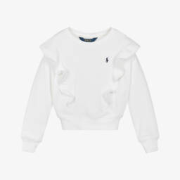 Casual and comfortable for girls, a navy blue jersey sweatshirt by Ralph Lauren. Made in a soft cotton blend, it has pretty ruffles down the front, with a small embroidered pony logo in white on the chest.