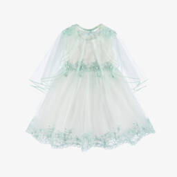 Mint green swimsuit for girls, handmade by Selini Action in silky smooth and stretchy fabric. Partly lined, this pretty one-piece is decorated with floral details around the layered neckline. The pink fabric flowers are finished with dazzling sequins, adding a touch of sparkle to her poolside look.