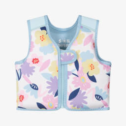Colourful ombré float vest for little girls by Soli Swim, in pretty shades of purple, pink, yellow and green, with a fun silver sea creatures print. Made in smooth neoprene, it has firm yet lightweight padding for optimum support and fun in the water. It fastens with an easy zip on the front with a velcro tab at the top. Please be aware that this is a swimming aid and not a life-saving device.