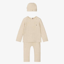 Ivory and navy blue striped cable-knit trouser set for baby boys by Tommy Hilfiger, made in a super soft viscose blend. The sweater fastens with a single button on the back, the trousers have a gently elasticated drawstring waist, and the hat has a turned up brim. Embroidered with the brand's flag logo and trimmed with signature detailing, the outfit comes in a branded gift box.